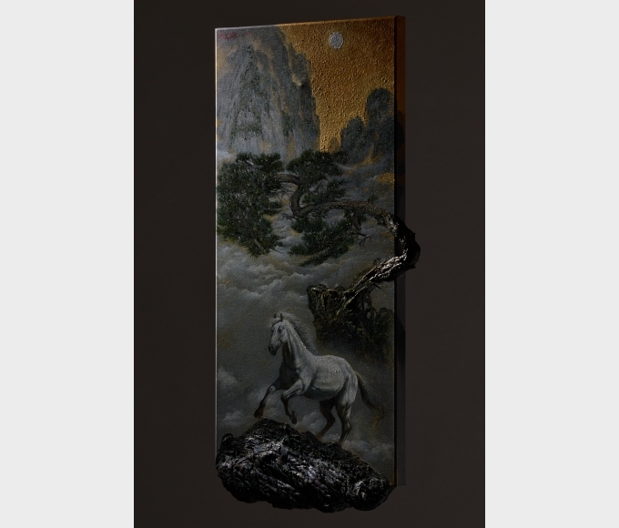 畫面中姿態桀驁、盤旋而出的松樹,以近乎龍形的結構橫貫空間,既指涉東方文化中「龍」所代表的權力、榮耀與歷史記憶,也象徵必須面對與跨越的挑戰。白馬與松樹之間形成動態張力:一者象徵無所畏懼、向上奔馳的生命能量;一者則承載著過去的重量與精神考驗。