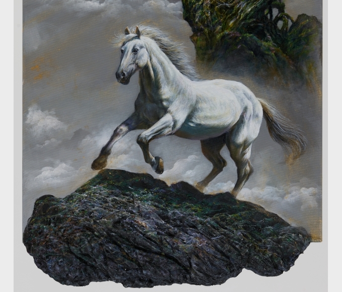 整體色調以灰暗、霧化的氛圍為主,象徵開疆闢土之前尚未明朗的混沌狀態,也暗示歷史進程中充滿不確定性的過渡時刻。在這樣的背景之中,白馬昂然躍出岩石,成為畫面最為凝聚的視覺核心,突顯其壯遊與奔赴未知的精神姿態。